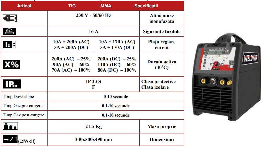 reglare curent pana la 200Amperi, cu masa proprie de doar 21.5 kg si cu alimentare la 230V. Datorita